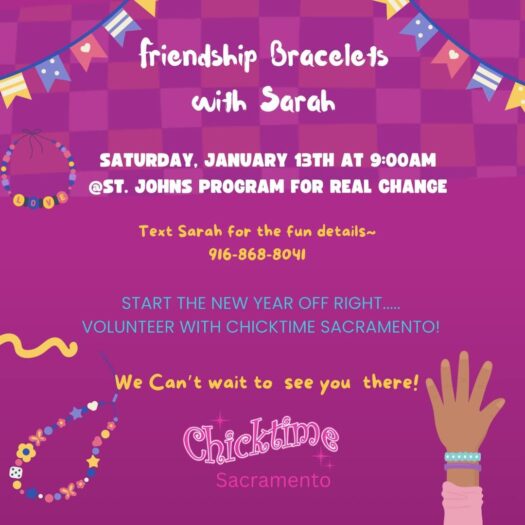 Chicktime Sacramento will not be meeting in the month of May. As much as we miss our workshops and time with our Chicktime kids we want to keep everyone safe! We hope to resume things soon.