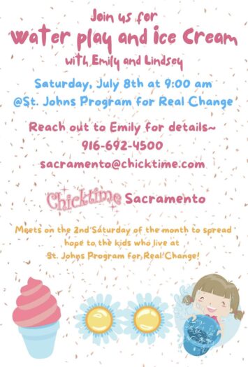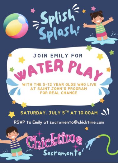 What a joyful time we had at our July water play workshop! Led by the incredible Emily Louden, this annual favorite brought so much fun and laughter to the kids at St. John’s Program for Real Change—and to our amazing Chicktime Sacramento volunteers too.