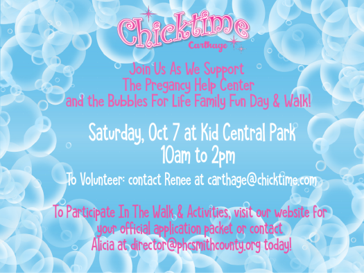Chicktime Carthage is so excited to support our charity partner, the Pregnancy Help Center at their Bubbles For Life Family Fun Day! PHC relies on the kindness and generosity of our community and they need your help in ensuring that the women that they care for receive the basic items every new mom needs as well as the education they need to prepare for their new lives as mommies! If you would like to attend or help in any way, please see the links below!