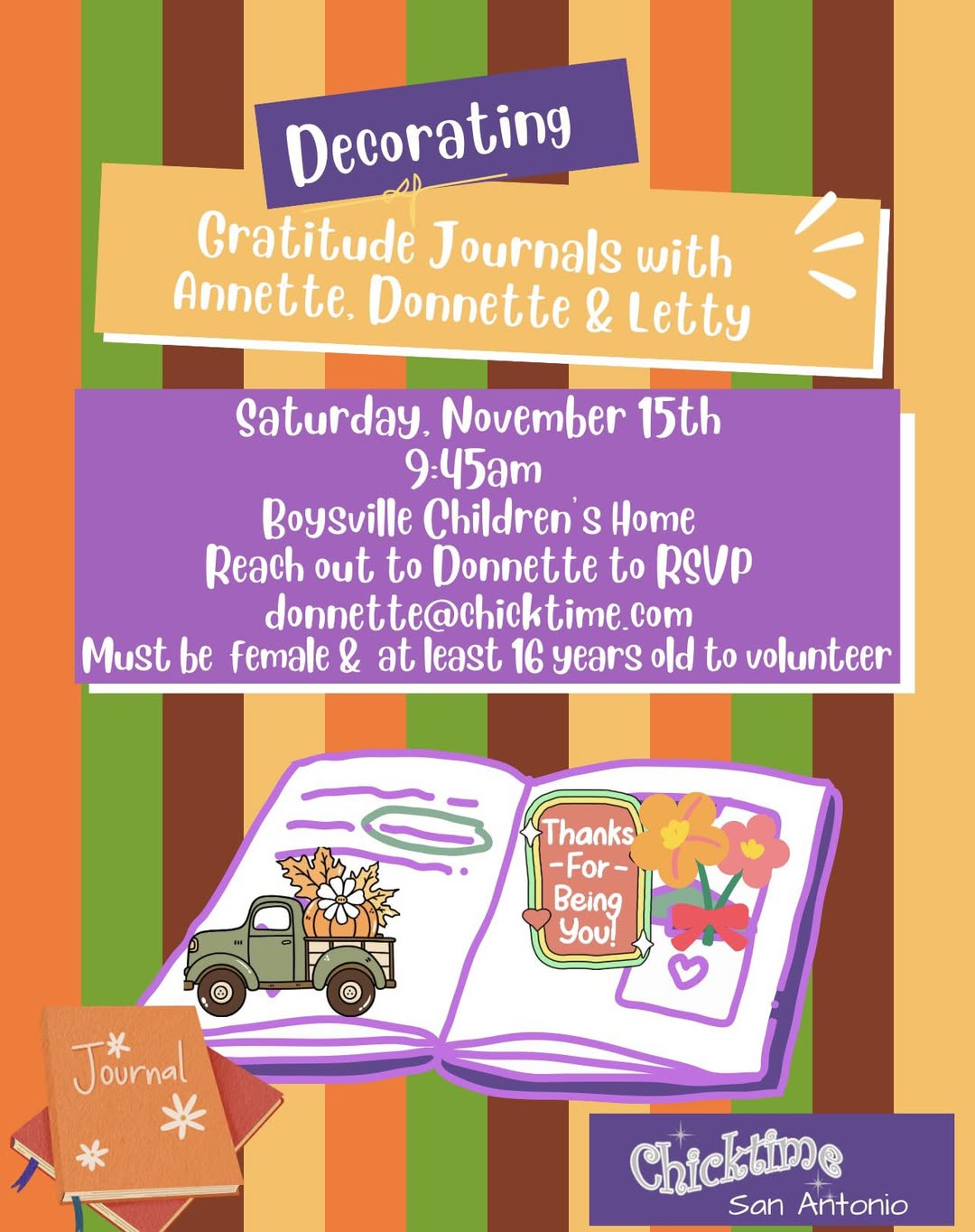 To explore Chicktime leadership, please click on the link to the left and read the free copy of our book, Chicktime. Pay special attention to chapters 4 & 5 to learn the nitty gritty of establishing a chapter and the responsibilities of the local leader. You may contact us at info@chicktime.com for more information (but we prefer that you read our very short book first!) 🙂