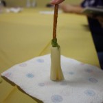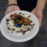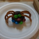 Now time for a snack! Nancy engaged us with delicious Halloween treats. First, a yummy spider we made from a chocolate mini donut, pretzels and M&Ms, which sat upon our spider web, made of pretzels and white chocolate. Then, a healthy witches broom from string cheese and pretzels.