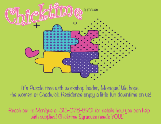 Hey Chicktime Syracuse! We just can’t sit still and not love the women at Chadwick Residence! We’ve decided we are going to drop off our monthly workshops since we can’t be there in person and miss the opportunity NOW to let them know we care! This month we dropped off Valentine’s Day boxes and goodies!! We sure could use your help in the next coming months ! We have several ideas for drop off activities we just need YOU to say yes to putting it together!
